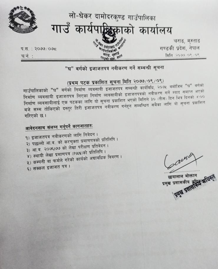 » `घ´ वर्गकाे निर्माण व्यवसायी ईजाजत पत्र नविकरण गर्ने सम्बन्धी सूचना।।।