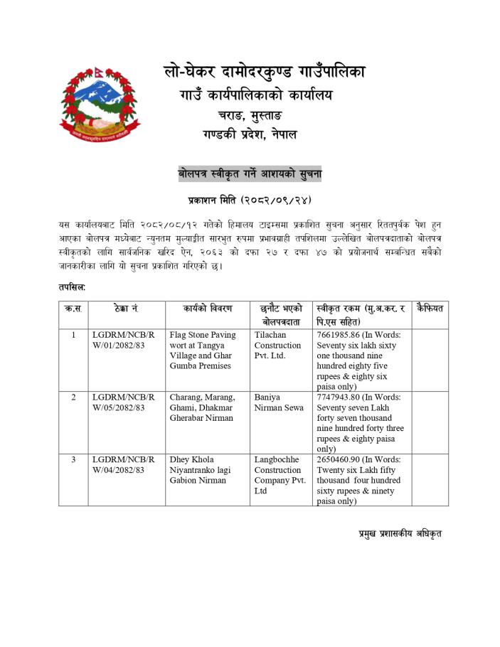 !!! बोलपत्र स्वीकृत गर्ने आशयको सूचना !!!