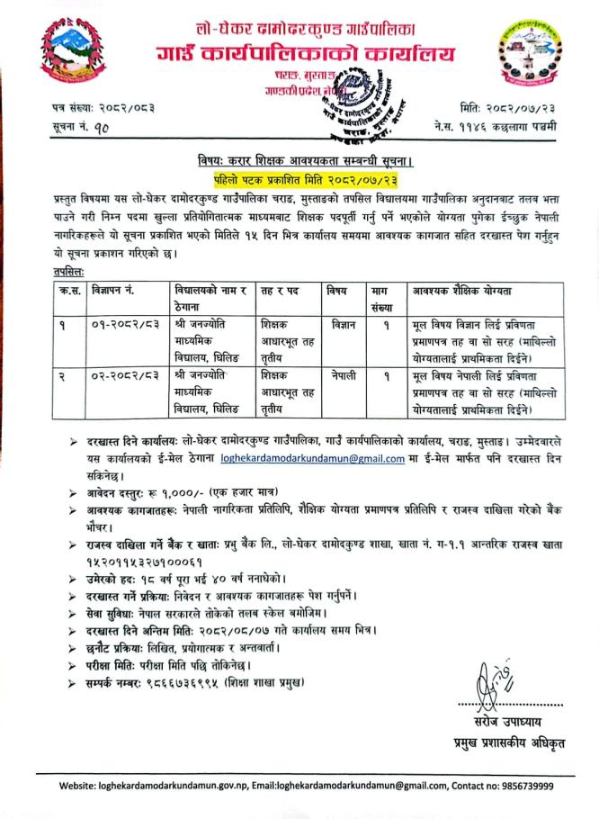 !!! विज्ञान र नेपाली शिक्षक आवश्यकता सम्बन्धी सूचना !!!